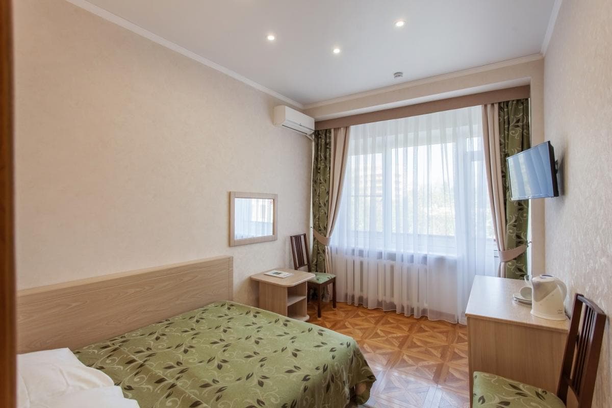 В номере: кровать, прикроватные тумбы, шкаф, стол, стулья, холодильник, спутниковое кабельное ТВ, электрочайник, набор посуды