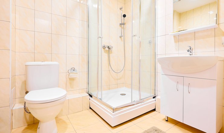 Санузел: с душевой кабиной, тапочки, туалетные принадлежности, фен